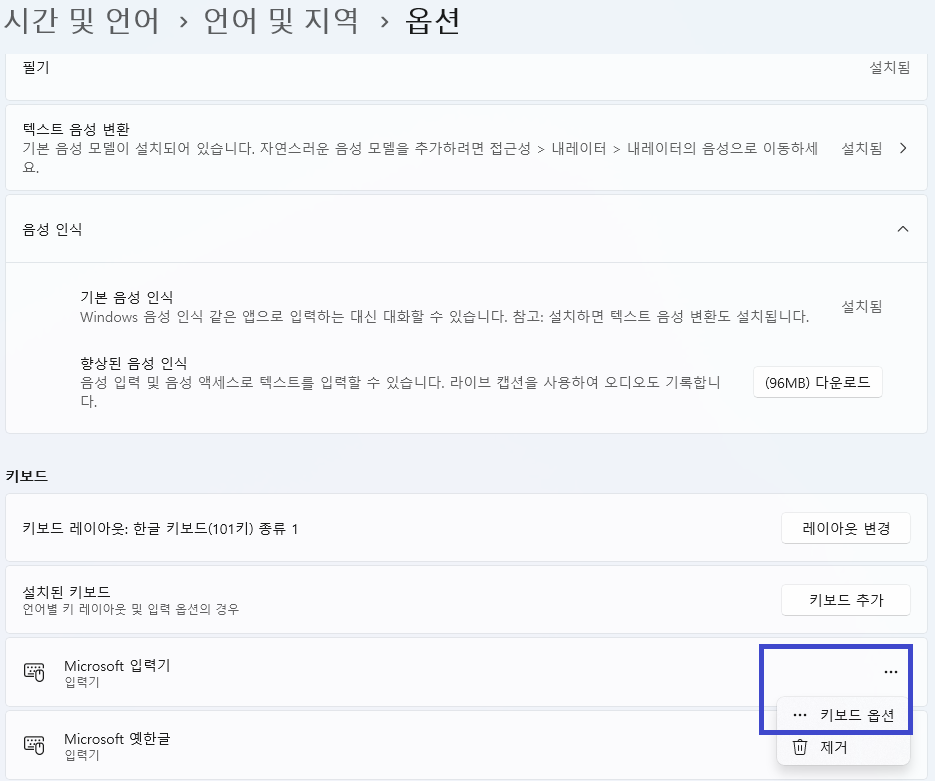 윈도우11 기준 설정 - 시간 및 언어 - 언어 및 지역 - 옵션