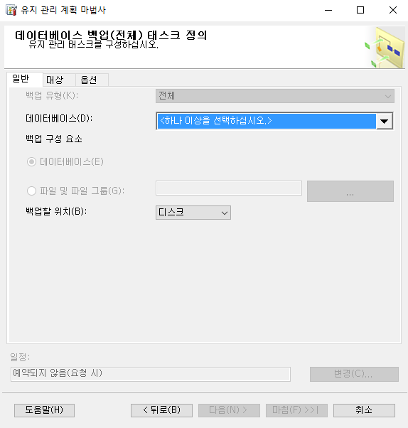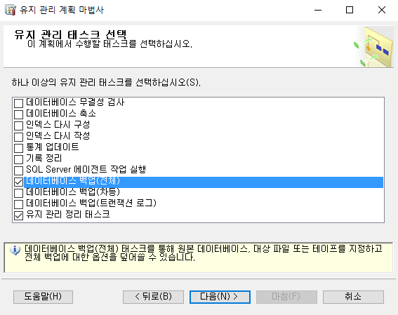 3. 데이터베이스 백업(전체)와 유지 관리 정리 태스크를 체크합니다.