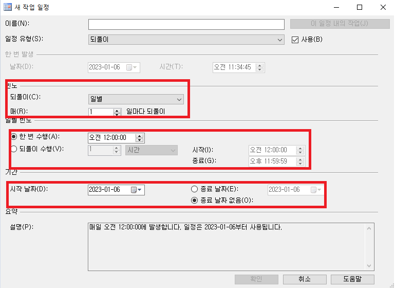 2. 등록할 스케줄의 이름, 설명, 일정을 설정합니다.